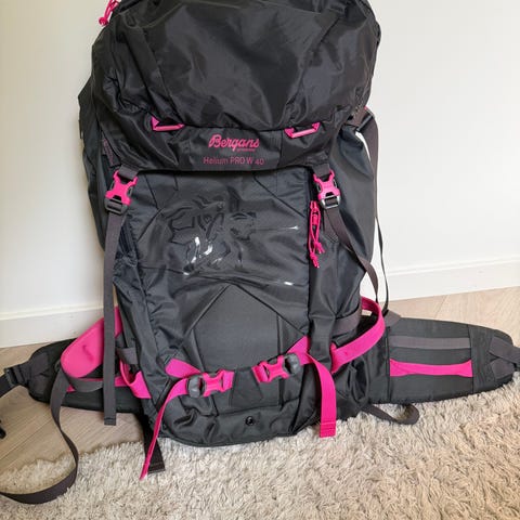 Fin sekk med flere rom, regntrekk, elastisk lomme til drikkeflaske og flere stropper og festeanordninger. Bryststropp og hoftebelte. Meget pent brukt.