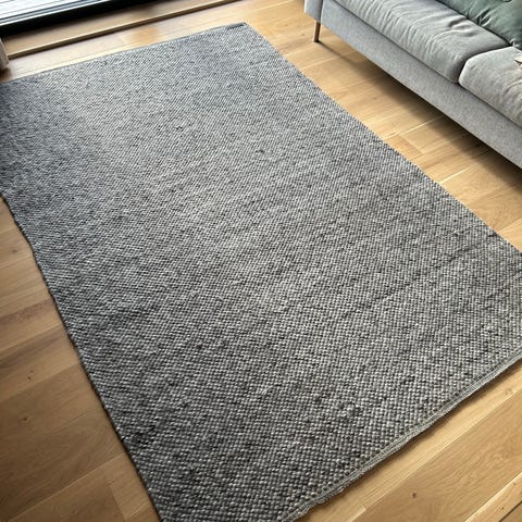 Stort ullteppe i svart/blåtoner/gråtoner selges. Kjøpt her på finn for 1,5 år siden. Teppet har flettet struktur og frynser i kortendene. Måler 245 lengde med frynser og bredde er 165. Må hentes på Nesodden.