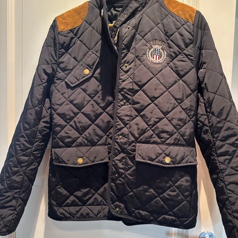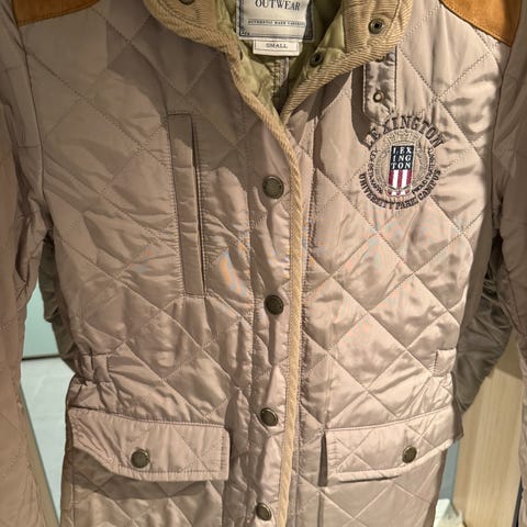 Lexington i blå farge, størrelse S for damer. Jakken har quiltet design med detaljer i kontrastfarge på skuldrene. Den har knappelukking og frontlommer. Materialet ser ut til å være lett polstret, egnet for utendørs bruk.