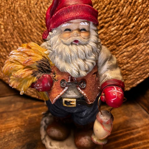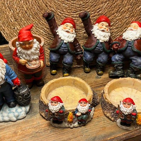 Ca 13-14 cm høye. Nisseluen til den ene bør limes da den har løsnet.