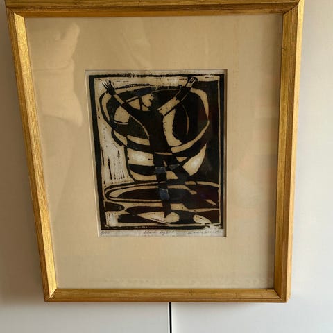 Signert originalgrafikk med abstrakt motiv i svart og brunt. Bildet er innrammet og signert av kunstneren. Passer til dekorasjon i hjem eller kontor. Ramme og bakside er inkludert.