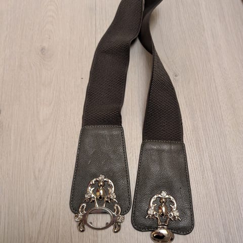Sort damebelte med sølvfarget spenne. Lengde på beltet er ca 110 cm. Beltet er laget av skinn og har flere hull for justering. Se bilder.