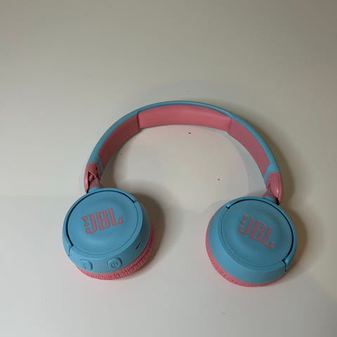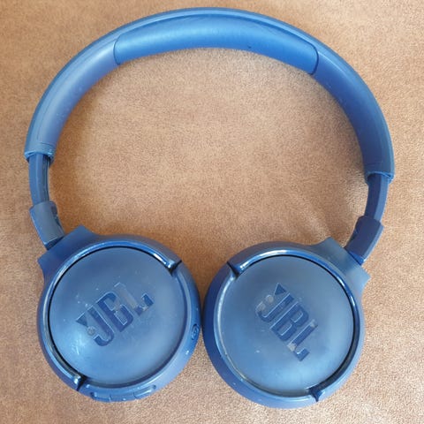 JBL trådløse hodetelefoner i blå farge med justerbar størrelse. Designet for komfort og brukervennlighet. Egnet for daglig bruk og lytting til musikk eller andre lydkilder.