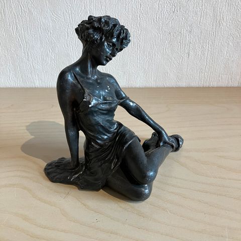 Søt vinterjente med grå kjole og strikket lue (rød/grå). 10 cm høy. Koselige fletter, mørk rødt skjerf/votter tilogmef en liten snøkrystall på votten. Ukjent materiell, alder og opprinnelse. Kommer fra arvebo. Ingen skader det jeg kan se, men et lite felt på undersiden uten maling/glasur.