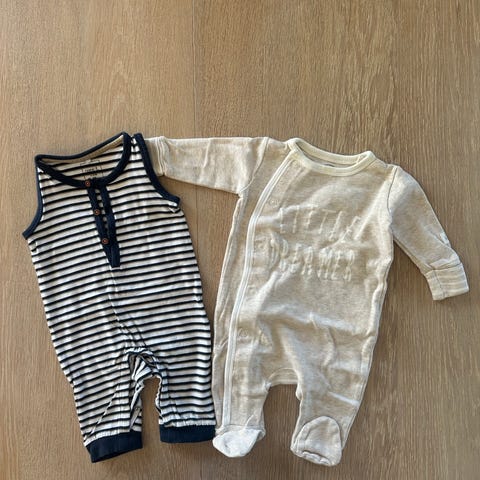 To pysjamaser med fot i bomull, lite og pent brukt.