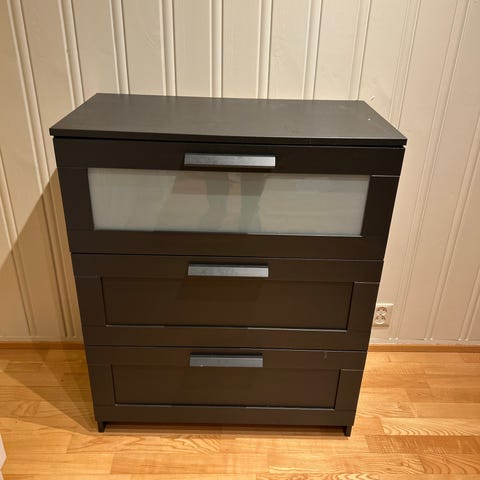 IKEA Brimnes kommode i hvit farge. Kommoden har flere skuffer i ulike størrelser, inkludert en skuff med glassfront.