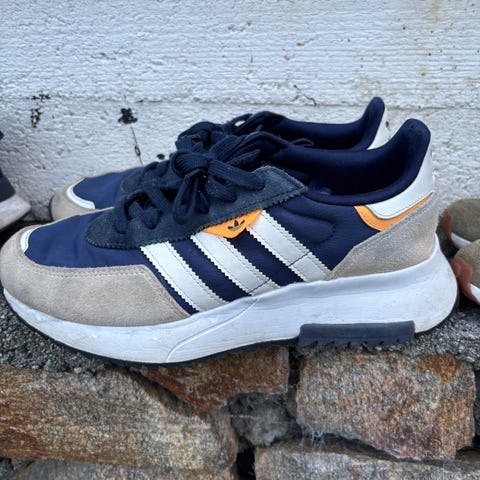 Adidas sneakers joggesko i størrelse 41,5 Skoene har svart og hvit fargekombinasjon med mønstret stoff og svarte detaljer. Designet som lavsko med snøring og gummisåle. Som ny.