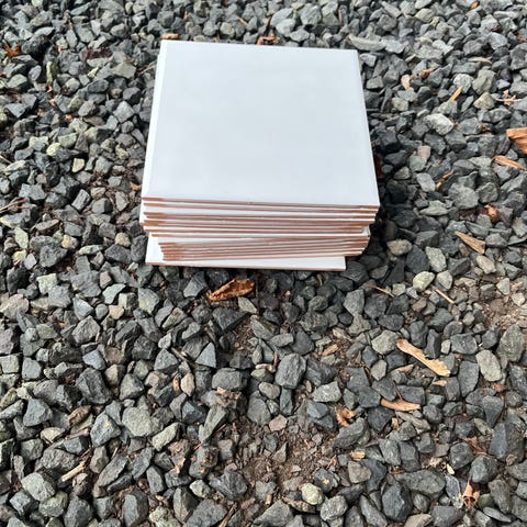 Selger en pakke med hvite blanke/glossy keramiske fliser fra IKEA. Hver flis måler 15x15 cm. Flisene har en hvit, blank overflate.