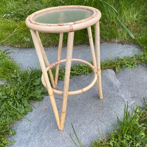 Fint retro blomsterbord i bambus/rotting med glasshylle.
