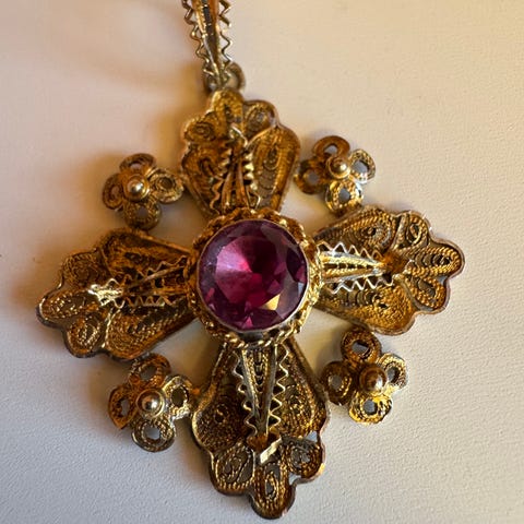 Utsmykket filigrant korssmykke / anheng fra begynnelsen av 1900-tallet. Håndverksmessig laget av 935S sølv (se bilde). Vekten er 8 gram.