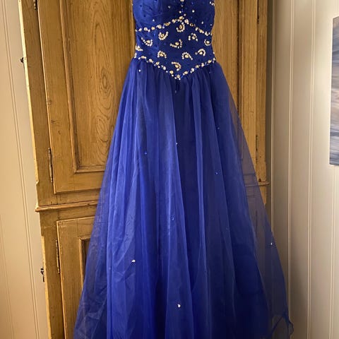Ballkjole i blå farge, størrelse S. Kjolen har et langt skjørt med et tyll-lag og en overdel med mønster. Egnet til formelle anledninger.