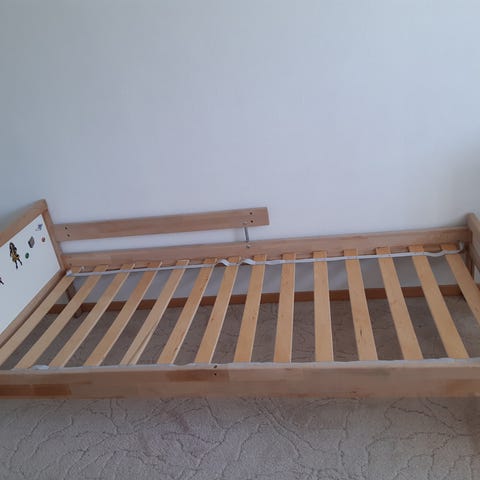IKEA enkeltseng i tre med lamellbunn. Sengen har en enkel og funksjonell konstruksjon med trelameller som gir støtte for madrass. Passer til enkeltmadrass og egnet for soverom med begrenset plass.