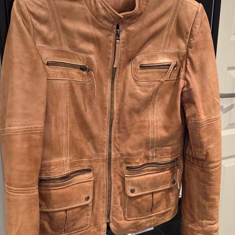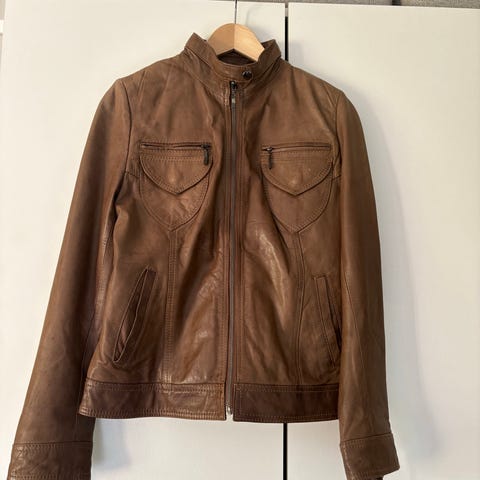 Jazz skinnjakke for kvinner i størrelse M, brun farge. Jakken er laget av ekte skinn og har glidelåslommer foran samt glidelås i front. Jakken har en enkel og klassisk design med brodert Jazz-logo på innsiden. Pent fòret.