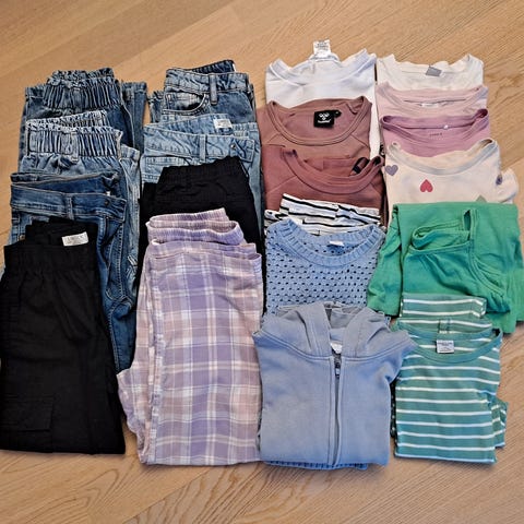 Diverse klær. Bukser, genser, kjoler, strømpebukser og ulltrøyer.