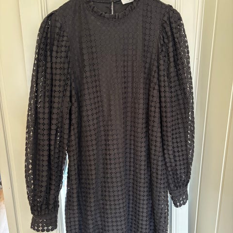 Festkjole i størrelse M med trekvart lange ermer og rund hals. Kjolen har et mønster med hullstrikk i behagelig bomull. Ermene har volang nederst. Lett og luftig kjole.