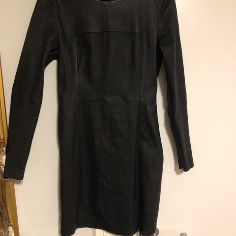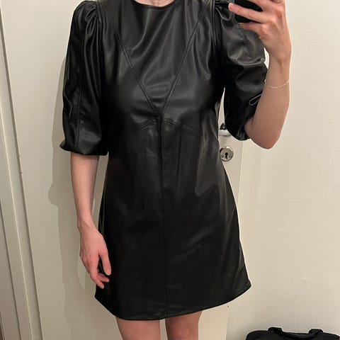 Stilig og edgy kjole i skinnimitasjon fra H&M. Kjolen er opprinnelig str 44, men har blitt sydd inn slik at den nå passer perfekt for str 36–38.