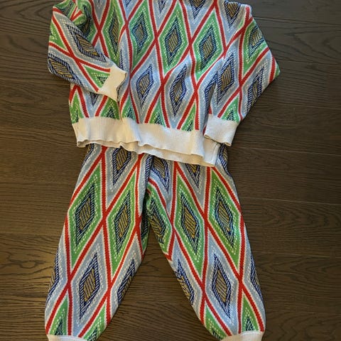 Selger et sett fra PINK Victoria's Secret som er brukt én gang. Begge delene er i størrelse M. Det består av en lyseblå genser og sort yogatights. Genseren har høy hals med knappelukking øverst, ribbede ermekanter med svarte striper, en lomme foran, lavt nede på magen, med åpning fra begge sider og «Pink»-logo både foran og bak. Tightsen er svart med lyseblå felt langs sidene, snøring i livet, liten hundelogo foran og «Pink»-trykk nederst på benene. Stoffet på genseren har blitt noe lysere under ene armen, men det synes ikke noe særlig (se bilde elleve), og den har blitt noe nuppete etter vask – kan trolig fjernes. Selges ettersom det ikke blir brukt.