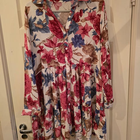 Søt og lett kjole fra H&M Divided. Står som str 42, men den er liten i størrelsen og passer bedre til deg som bruker str 36–38. Mykt og behagelig stoff, v-hals og løstsittende fasong. Perfekt til både hverdags og sommerdager.