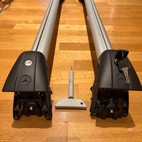 Mercedes-Benz takstativ i aluminium med sølvfarge. Passer for montering på taket av kjøretøy for å frakte ekstra last. Inkluderer låsemekanisme med Mercedes-Benz logo og nødvendig monteringsutstyr samt bruksanvisning.