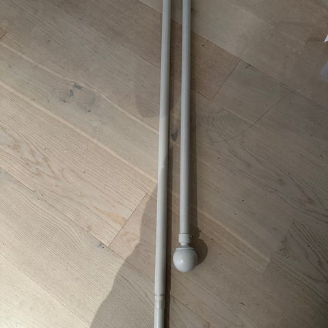 Selger svart enkel gardinstang med x2 veggfeste. Uttrekkbar stang, 2m lang på det meste. 2 lengder på 110 cm.