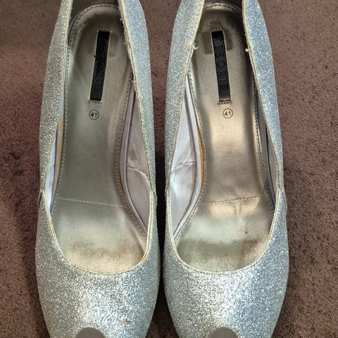 Er brukt 1 gang på ball. Str 37. Fargen er beige med glitter på tuppen. Er en liten flekk/merke på hver av skoen, se siste bilde. Skoene er ikke blitt tørket/vasket, så mye mulig flekk går bort.