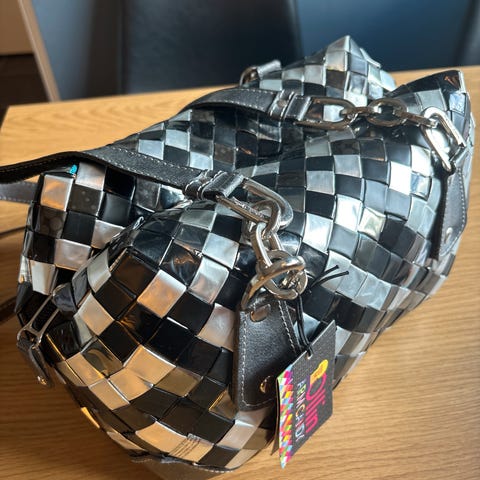 Dame veske laget av kunstlær i svart farge. Vesken har en skulderstropp med metallringer og glidelåslukking. Den har et romslig hovedrom med innvendige lommer for oppbevaring av mindre gjenstander. Passer til daglig bruk.