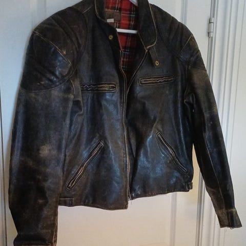 Jakken er ganske lett og er 58 cm i brystvidde fra armhule til armhule og 73 cm i lengde fra under kragen og ned. Ekte skinn. Knappene kan med fordel strammes. Ellers veldig kuul på. Det står XL men den er mer som en Large eller oversized Medium for menn og XL for høye damer. Kan sendes med postnord for 69 ved forespørsel eller fiks ferdig.