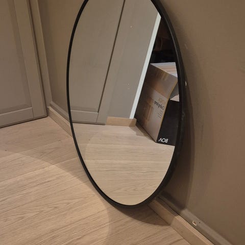 Rundt speil med stropp for oppheng. Pent brukt, bittesmå merker i rammen.