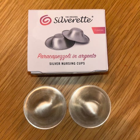 Pent brukte sølvkopper til å beskytte såre brystknopper. Vaskes mellom hver bruk (med mild såpe).