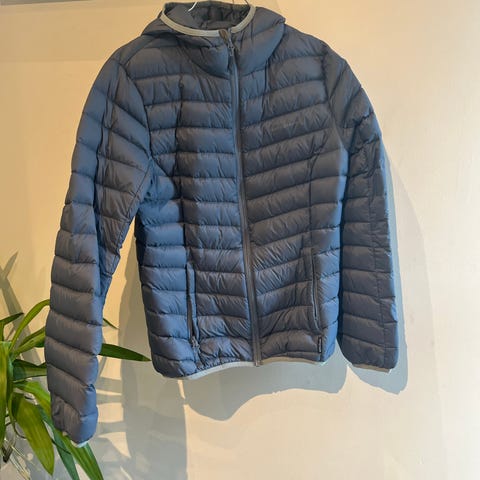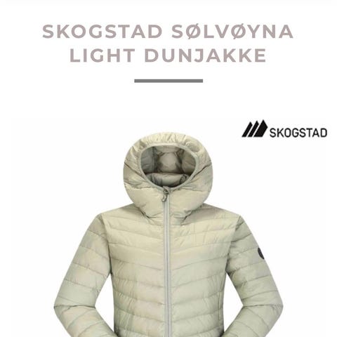 Fin og lett dunjakke fra Skogstad i str 34. Kun brukt noen få ganger, ingen slitasje. Jakken har hette og er i en kjempefin blå farge. Perfekt under skalljakke.