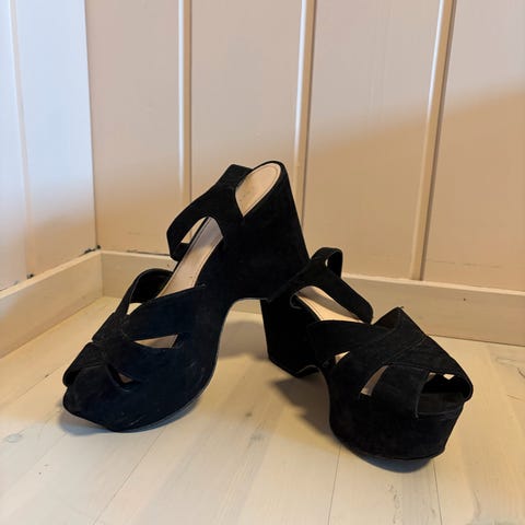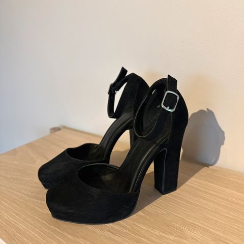 Smukke og festlige hæler i svart semsket skinn str 41. Kjøpt i København fra stilige Gardenia Copenhagen, men selges da de brukes for lite. Er flotte både sommer og vinter.