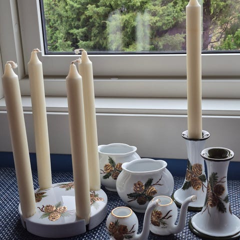 Vintage håndmalt porselensett med bolle og lysestake kr 100.-samlet.