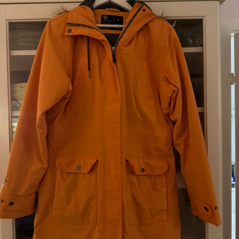 Bergans Annet yttertøy i oransje for dame, størrelse M. Jakken har hette, frontknapping og lommer. Materialet er egnet for utendørs bruk og gir beskyttelse mot værforhold.
