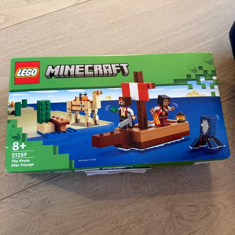 Lego Minecraft pirate skip nr 21152 til salgs. Den har tre legofigurer + en skilpadde, en papegøye og en delfin. I tillegg er det en robåt med to årer. Den har et skip og en øy med skattekiste og tnt. Det er et gøy sett både å bygge og å leke med.