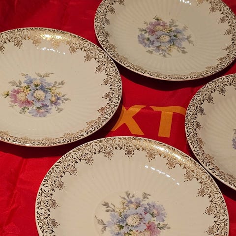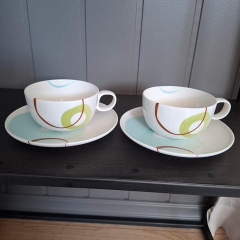 Selger noen deler av serviset Disk blue fra Royal Fine China, kjøpt på Tilbords. Alt på bildet utenom det som er markert med rødt selges samlet for kr 500,-