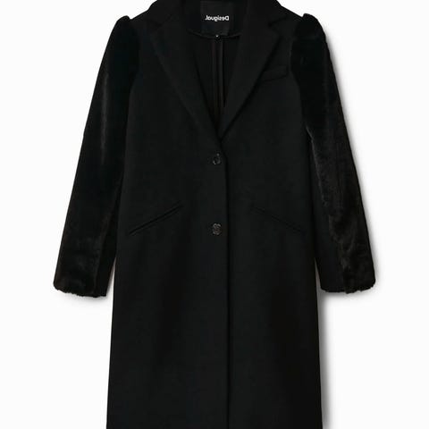 Desigual kåpe i størrelse M. Kåpen har et flerfarget mønster med ulike teksturer og materialer. Veldig flott på!