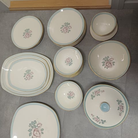 3. 5 store suppetallerkener: 23 cm i diameter. Kr 20 pr stk. Noen krakeleringer,naturlig etter noen års bruk.