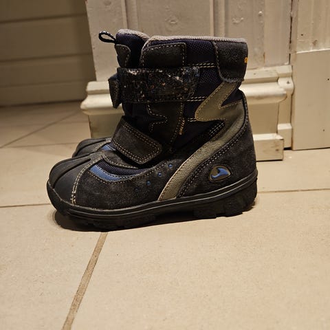Viking vinterstøvler for barn, størrelse 28, i lilla farge. Slitt i tuppen særlig på den ene skoen, vist på bildet.