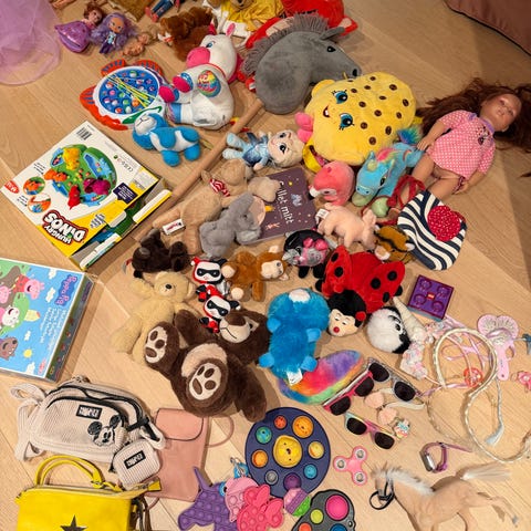 Selger samlet som vist på bilder: Ty julebamser, armbånd, viskelær, penner, skriveblokk, regnbueslim, figurer til settekasse, nøkkelringer, leppepomade og hårstrikk med juletre.