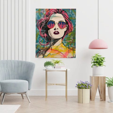 “Skyline Dreams” er et fargerikt og uttrykksfullt portrett der byen speiles i glitrende solbriller. Kontraster, tekstur og lagvise materialer gir verket dybde, energi og et moderne preg.