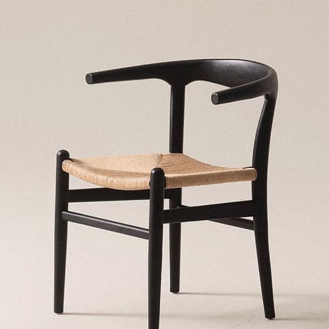 Stol av massiv alm. Trefarget er overflatebehandlet med lakk. Hvitsåpet alm med lys og svart sete har såpet overflate uten lakk. Sete av papirsnor. Robust alm i kombinasjon med sete av papirsnorer blir en vakker kontrast og gir god sittekomfort.