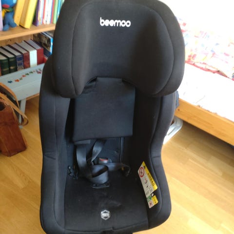 Beemoo Bilsete til baby med kapasitet opp til 18 kg. Setet er svart og utstyrt med sikkerhetsbelter og støtteben for stabilitet. Egnet for bruk i bil med retningslinjer for montering og airbag-advarsler tydelig merket.