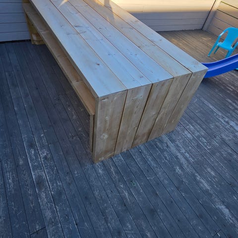 Sett med utemøbler i tre bestående av en benk og bord. Møblene har en enkel, rektangulær design med naturlig impregnert treverk. Passer for utendørs bruk på terrasse, inngangsparti eller i hage.