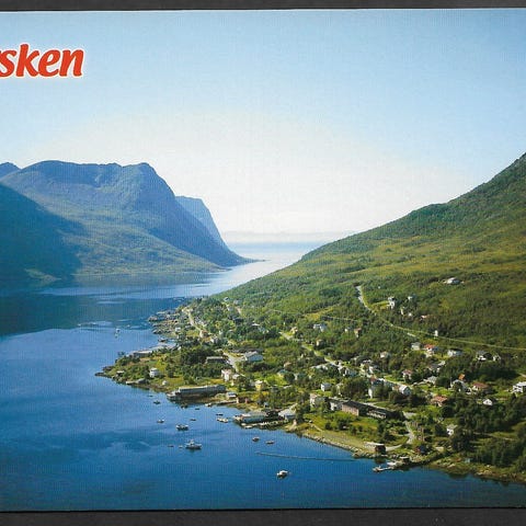 Postkort med motiv fra tettstedet Lyngseidet i Lyngen kommune. Lyngsalpene i bakgrunnen. Strøkent, ubrukt A6-format, se bilder
