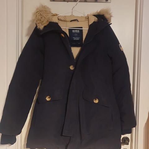 Selger en pent brukt Svea-jakke i klassisk marineblå. Jakken er i størrelse medium og sitter fint på. Den er varm, behagelig og passer perfekt både til hverdags og kalde dager da den er god og varm. Ingen skader eller flekker kun normal, lett bruk.