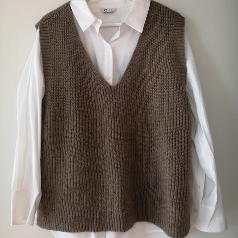 ONLY Grå vest (for kvinner) i størrelse M men den er jeg må si mer som str L. Laget i strikket materiale med V-hals. Passer til lag-på-lag bruk eller som et enkelt plagg.
