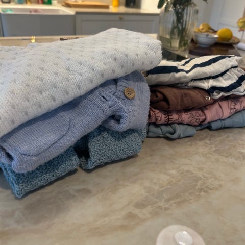 Hust & Claire barneklær i størrelse 62, flerfarget, designet for unisex bruk. Settet inneholder ulike plagg med forskjellige mønstre og farger, egnet for små barn. 6 bodyer, en kortermet. Selges samlet