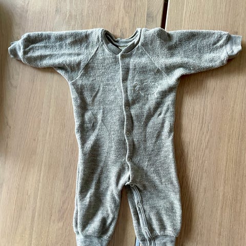 Dress i størrelse 86-92, 100 % merinoull. Nederste knapp foran mangler. Strikkede ullsokker, disse er knapt brukt.