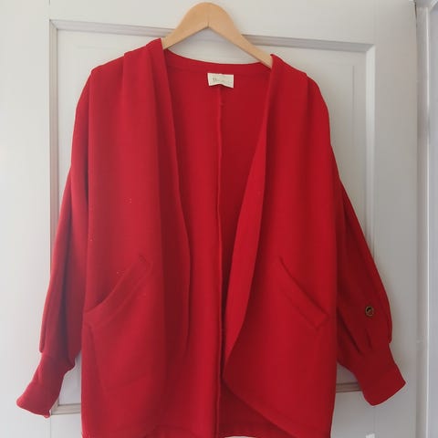 Rød cardigan i str.42 . Lommer fremme og puff i ermene ved skulder.