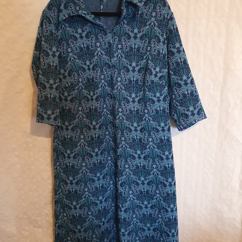 Nydelig kåpe i blått tekstil med fin tekstur og mønster. Nydelig innerstoff i glatt finish. Retroinspirert.